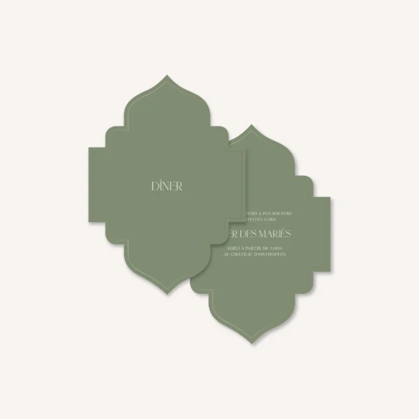 Succombez au charme de notre collection de faire-part de mariage oriental, un mélange irrésistible de vert élégant, d’orange abricot lumineux et de finitions dorées. Ses formes mauresques raffinées et son design moderne créent un univers chaleureux et sophistiqué qui fera sensation auprès de vos invités. Chaque pièce est parfaitement coordonnée, pour offrir une papeterie haut de gamme qui sublimera votre mariage et marquera les esprits dès le premier regard.