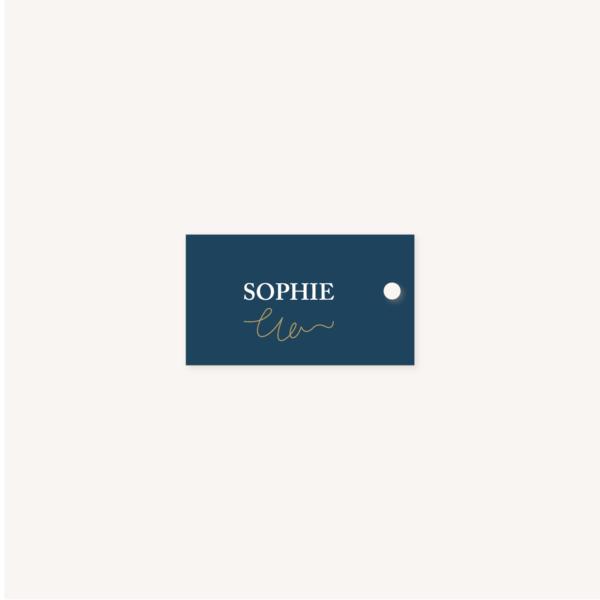 L’étiquette nom remplace le marque-place classique format chevalet, elle s’accroche au menu ou à la serviette par exemple, avec de la ficelle, du ruban, une épingle, un oeillet, etc.