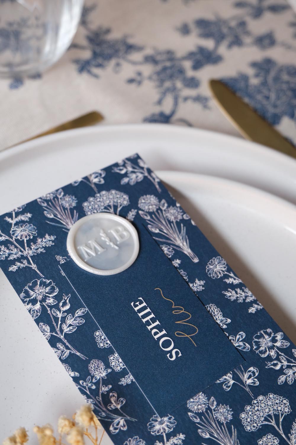 La collection NAVY GOLD invitera vos convives dans une ambiance élégante, au caractère raffiné et affirmé. Une papeterie de mariage aux tons bleu marine, blanc et or, où les fleurs subliment le tout.