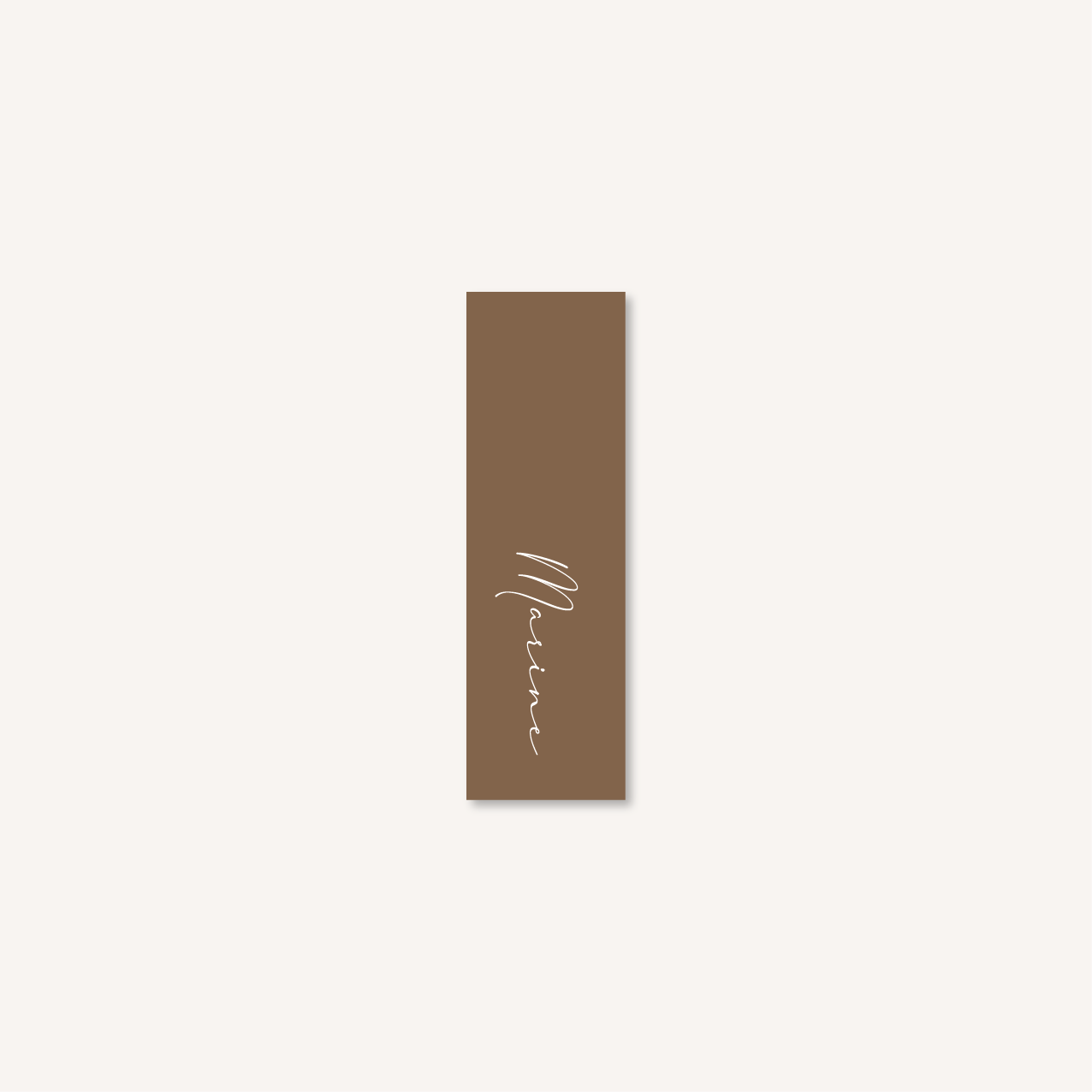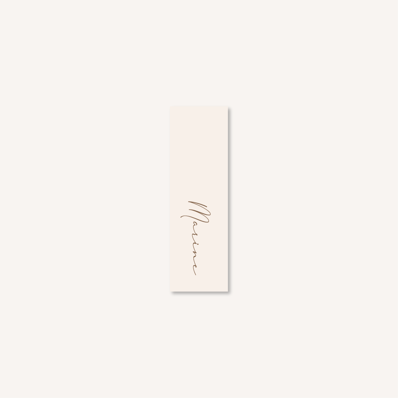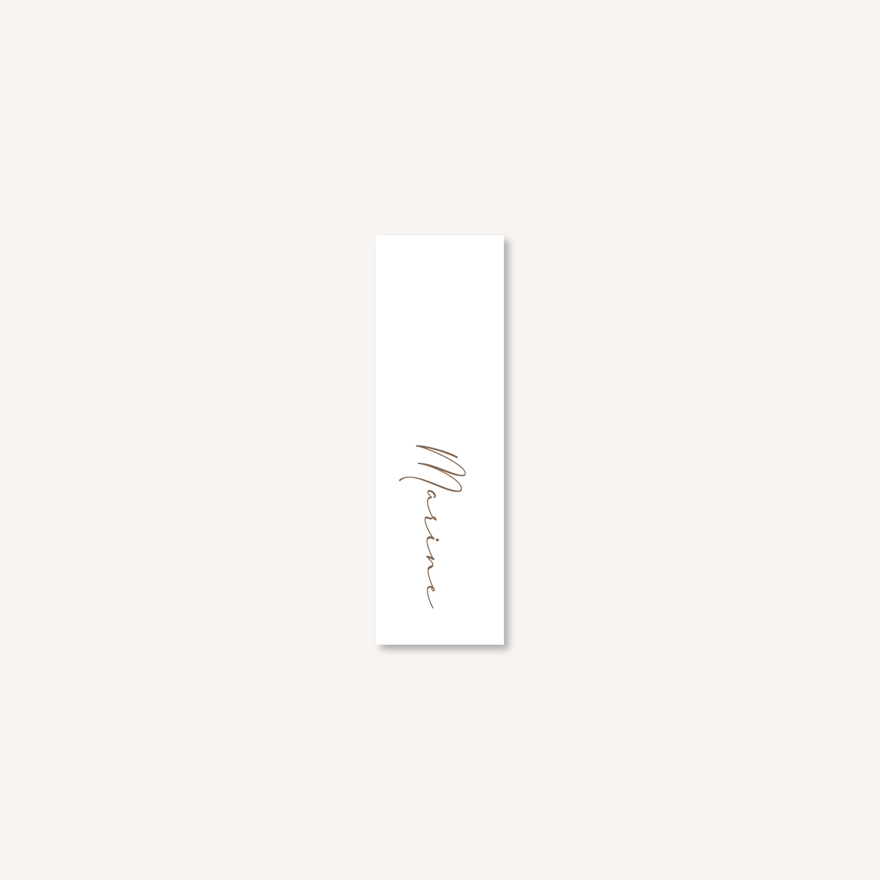 L’étiquette nom remplace le marque-place classique format chevalet, elle s’accroche au menu ou à la serviette par exemple, avec de la ficelle, du ruban, une épingle, un oeillet, etc.