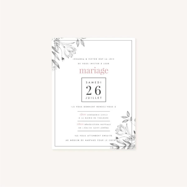 Idéale pour les mariages à l’univers intemporel et épuré, la collection Botanique invitera vos convives dans une ambiance pleine de douceur, mais au caractère affirmé. Fleurs chics et élégantes pour cette collection aux tons rose, noir et blanc, se marient à la perfection, afin de donner de la douceur à ce thème.