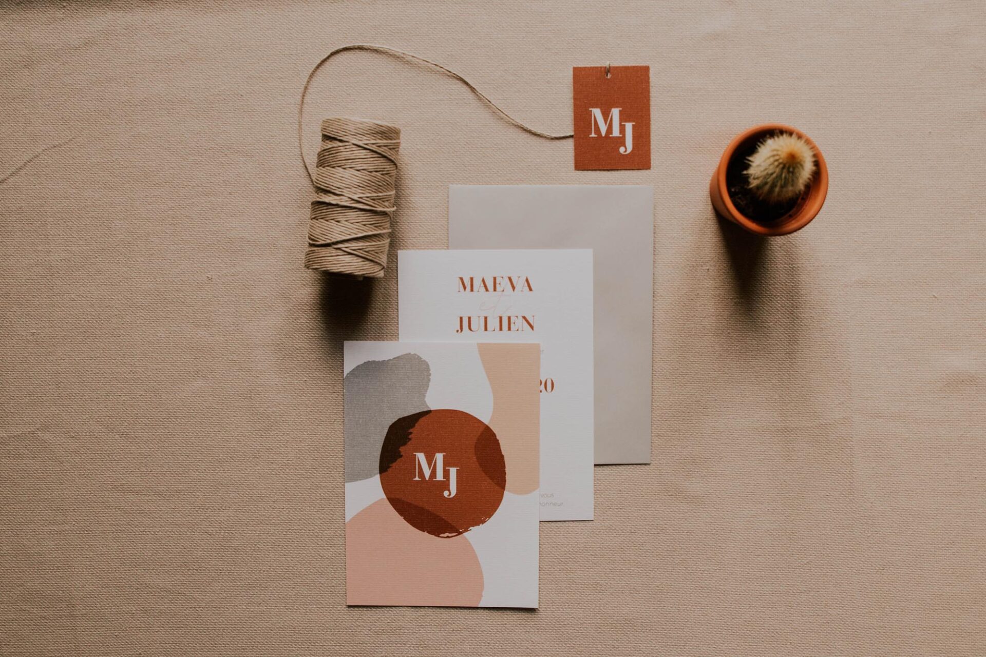 Couleurs chaudes et tendances pour cette collection mariage Sahara qui s’inspire du style boho, au graphisme épuré et abstrait. Elle sera parfaite pour un mariage minimaliste aux tons neutres.