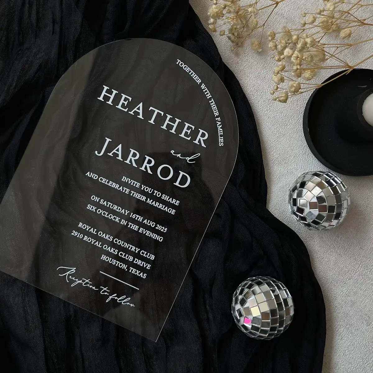 Le faire-part de mariage plexiglass en forme d’arche peut être complété avec un carton dîner, un carton brunch, un RSVP, et même une pochette de couleur ou en kraft, déclinés sur le même thème afin de constituer une belle invitation pour votre mariage.