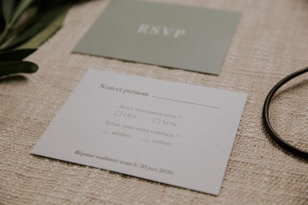 Ambiance chic et végétale pour ce carton RSVP qui s’inspire de la nature, avec sa couleur verte. Il sera parfait pour un mariage chic, sobre, naturel et végétal aux tons blanc et vert.