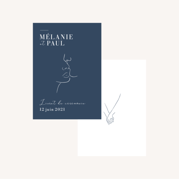La collection ONE LINE ART, c’est la collection de toute les possibilités. Un graphisme créé en ligne noire et une multitude de couleurs : c’est à vous de jouer et de composer la collection qui vous correspond.Il s’agit de la couverture du livret de cérémonie. Elles sont rainées, c’est à dire qu’elles auront une empreinte qui permettra de plier le papier sans le casser, et sont livrées à plat.