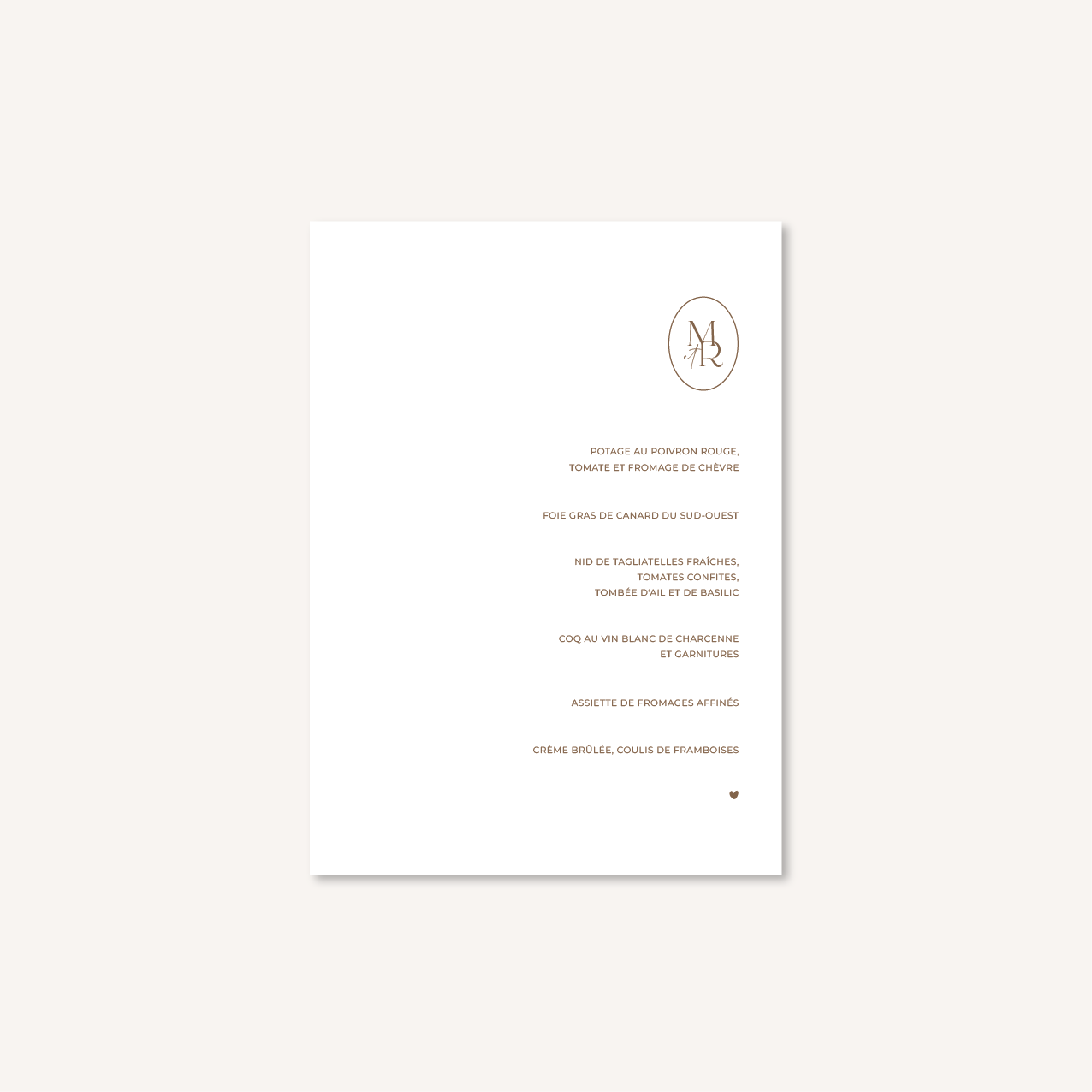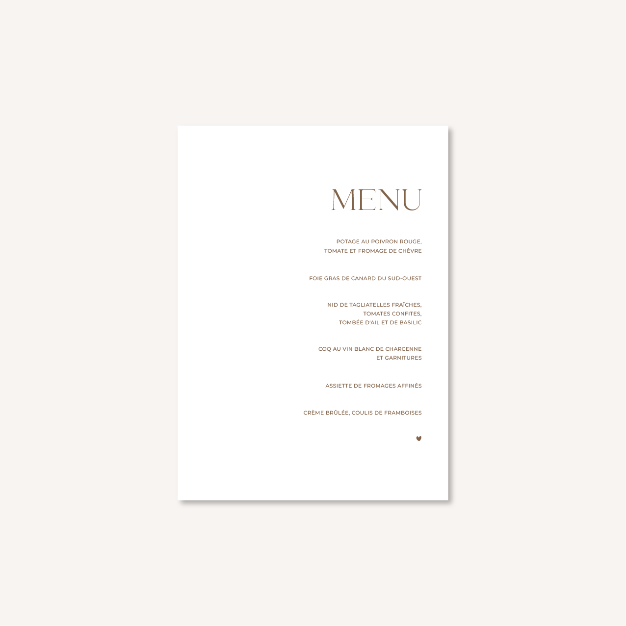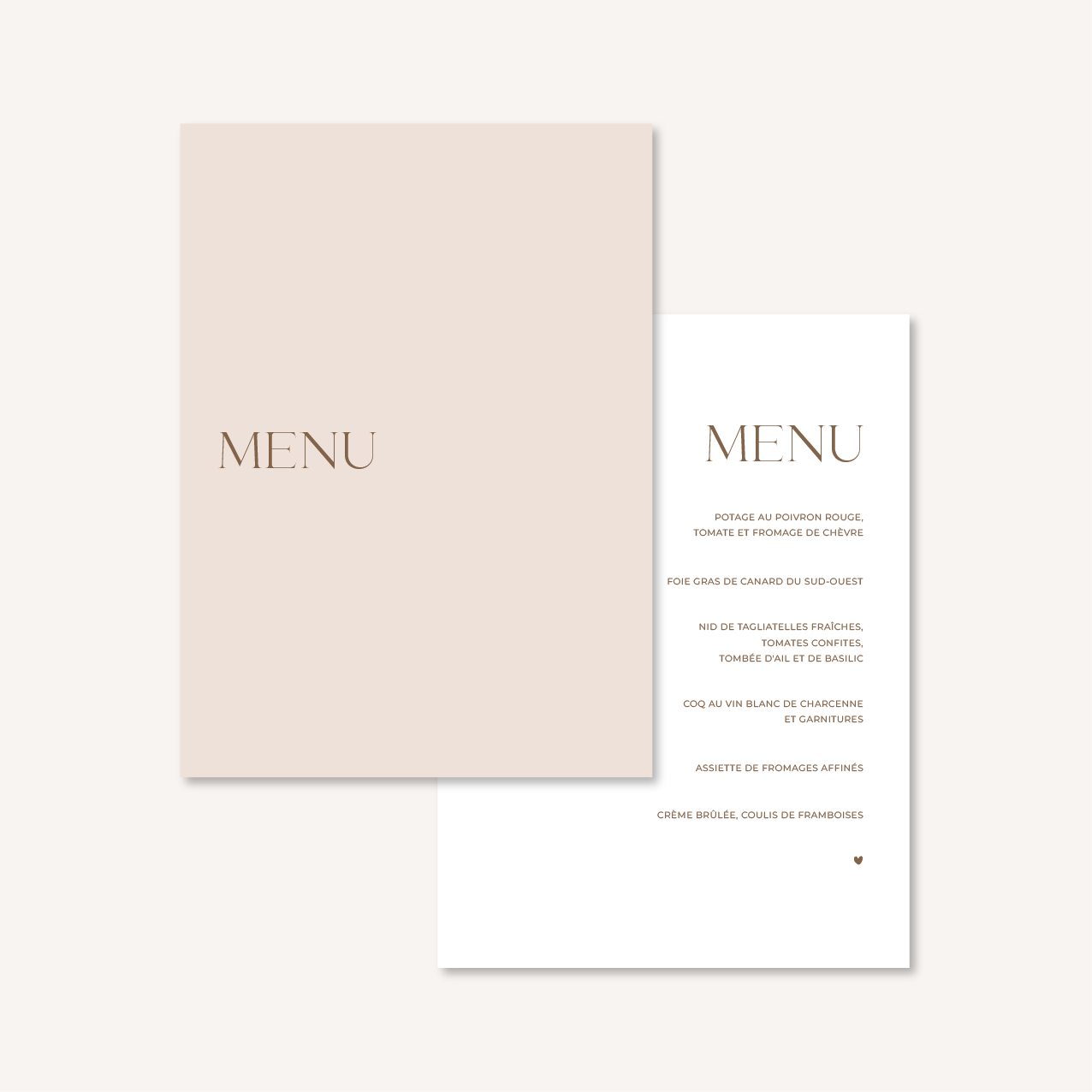 Le menu sera la touche finale de la décoration de votre table de mariage. Il se pose au centre de la table, contre sur support, encadré, planté dans votre composition florale, etc. Pour une table ronde, on vous recommande d’en utiliser 2 ou 3 par table, pour les autres tables, comptez environ un menu pour 4 à 6 invités.