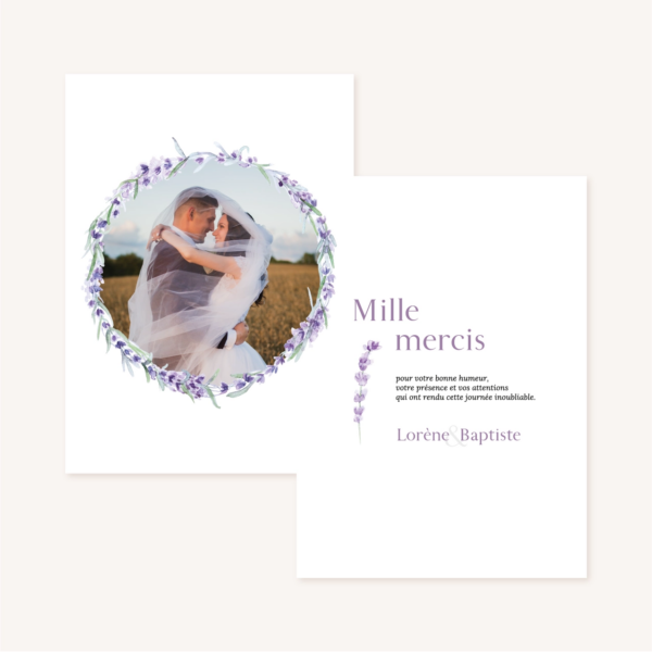Votre mariage est passé, il est temps de remercier vos invités avec le carton remerciements. Une photo de votre mariage au recto et deux options pour le verso : standard ou format carte postale. Le format carte postale permet de coller directement le timbre sur le carton au verso, vous n’aurez donc pas besoin d’enveloppe.