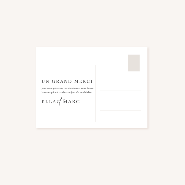 Votre mariage est passé, il est temps de remercier vos invités avec le carton remerciements. Une photo de votre mariage au recto et deux options pour le verso : standard ou format carte postale. Le format carte postale permet de coller directement le timbre sur le carton au verso, vous n’aurez donc pas besoin d’enveloppe.