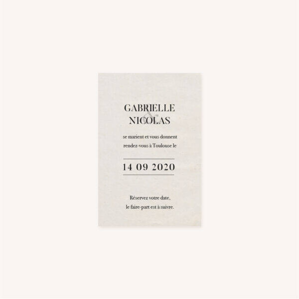 Le Save the date est idéal pour dévoiler la date de votre mariage tout en sobriété à vos futurs invités avant l’envoi de votre faire-part, qui lui contiendra toutes les informations précises du programme du mariage.