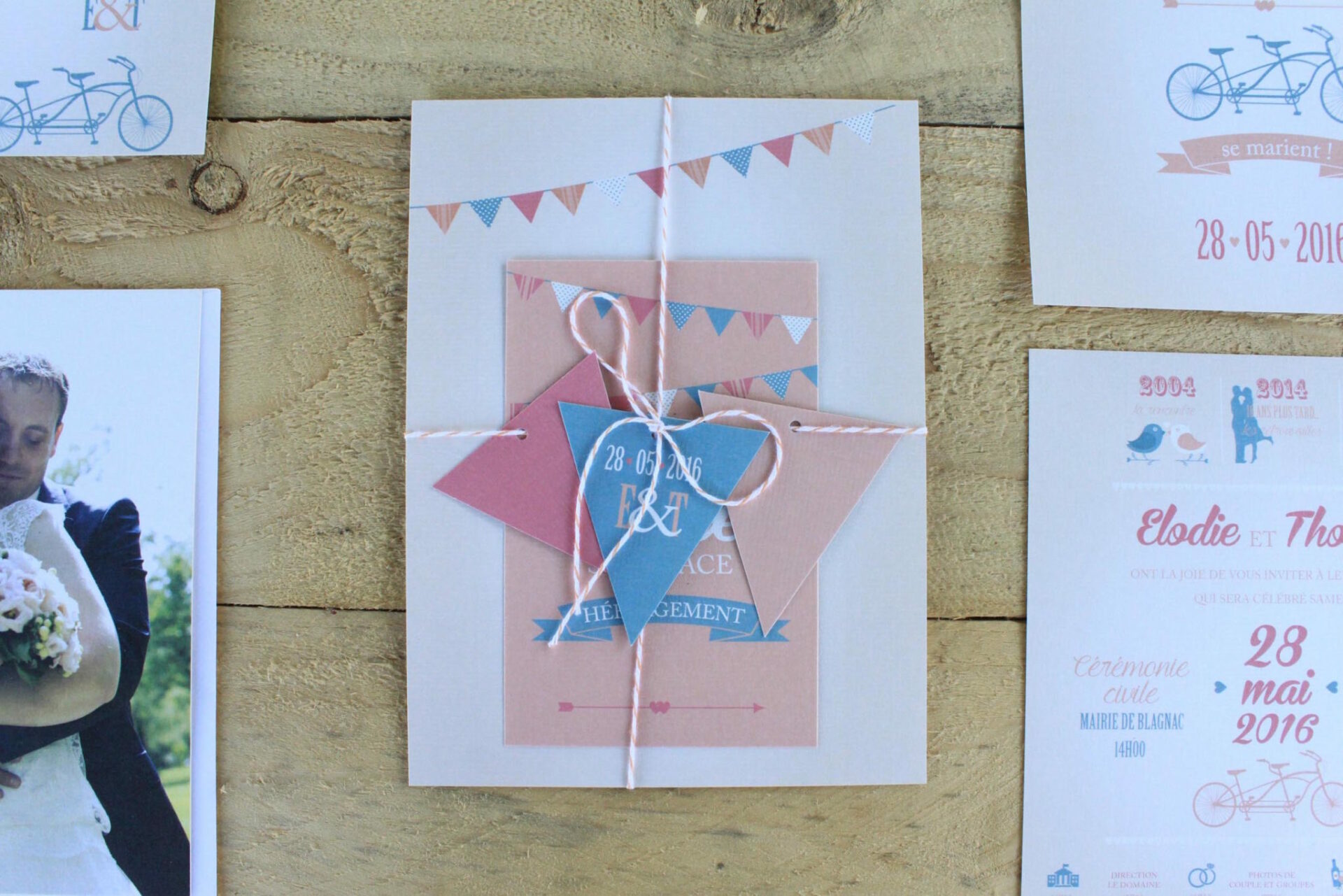 Ce faire-part est en plusieurs parties, il est composé d’un carton principal aux couleurs pêche, rose et bleu dans un esprit guinguette vintage (format 15X21cm recto/verso), d’un carton hébergement (format 8X13cm recto/verso), d’un trio d’étiquettes en forme de fanions, et d’une ficelle bi-colore pêche et blanche qui permet de lier les 2 cartons.